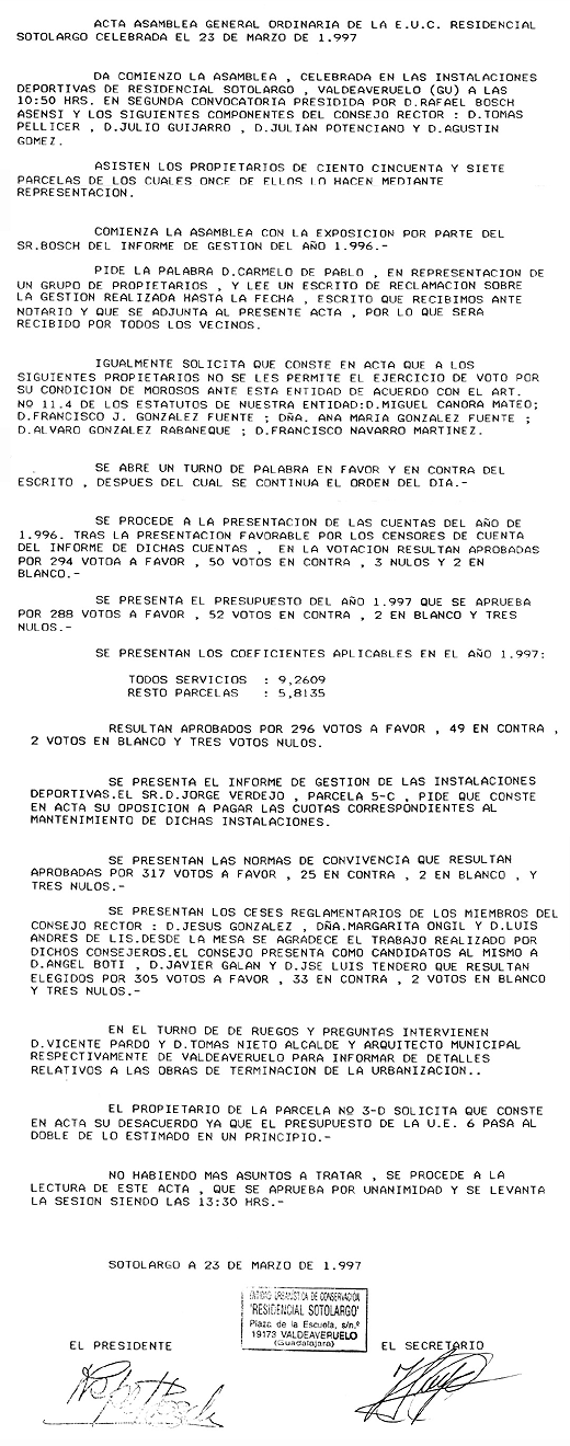 Acta de la Asamblea General del 97 que enviaron a todos lospropietarios.
